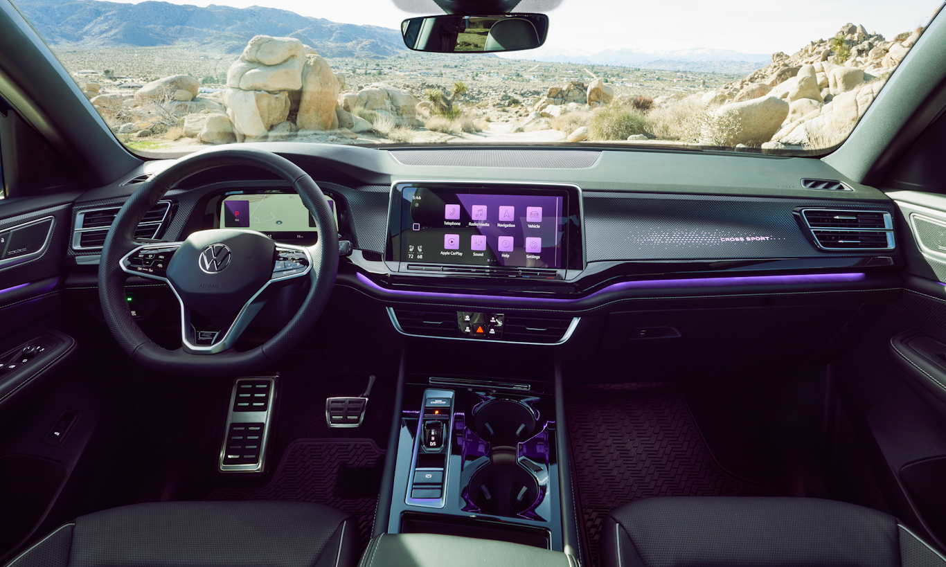 Atendendo a pedidos, a Volkswagen melhorou o interior do Atlas. O SUV grande ganhou uma faixa de couro no painel e superfícies macias, tanto no painel quanto nas portas – antes a região era decorada com plástico duro. Há também uma faixa imitando madeira e luz ambiente com 30 cores diferentes.