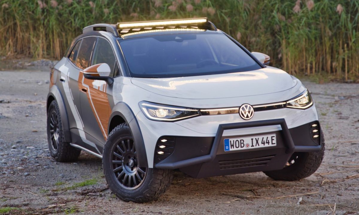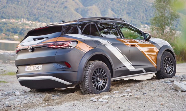 A suspensão foi elevada e o Volkswagen ID.4 ganhou pneus off-road com rodas menores. Para ajudar no estilo mais parrudo, alargadores de para-lamas feitos em impressora 3D deixam o modelo mais largo e protegem a carroceria de pedregulhos jogados pelos pneus – além de dar o estilo clássico de um modelo aventureiro.