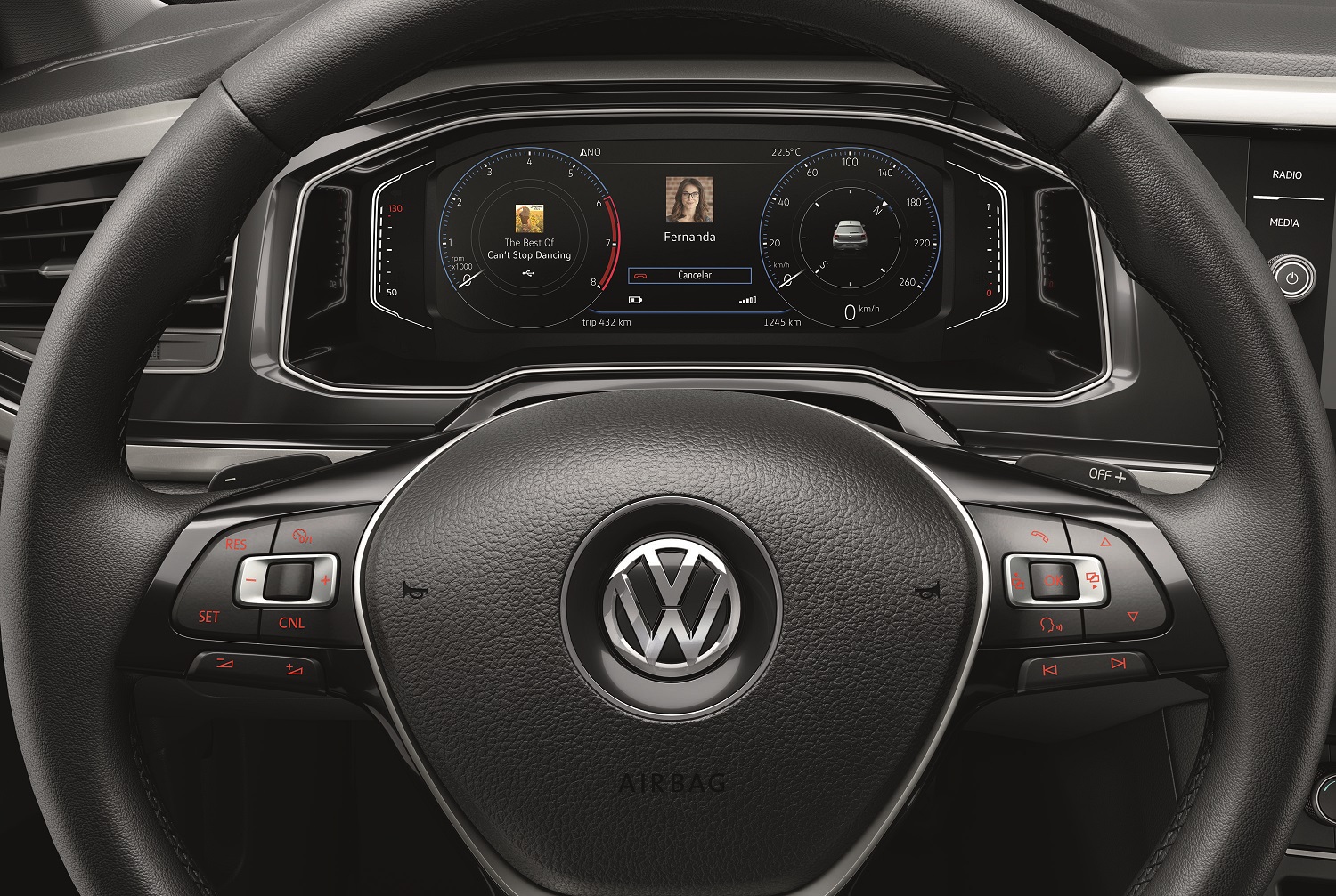 Por dentro, o estilo segue o já encontrado no Polo. Há cabine de linhas horizontais e painel de instrumentos digital Active Info Display de 10,2 polegadas aliada à central multimídia Discover Media com tela de 8 polegadas. Bacana é o “manual cognitivo” instalado no multimídia: um sistema de inteligência artificial que ajuda o motorista a responder perguntas sobre o veículo, incluindo informações do manual do carro. A consulta poderá ser pelo App Volkswagen através da escrita, comandos de voz e até foto, sendo que o sistema aprende cada vez mais à medida que se usa ele — reconhecendo também sotaques.