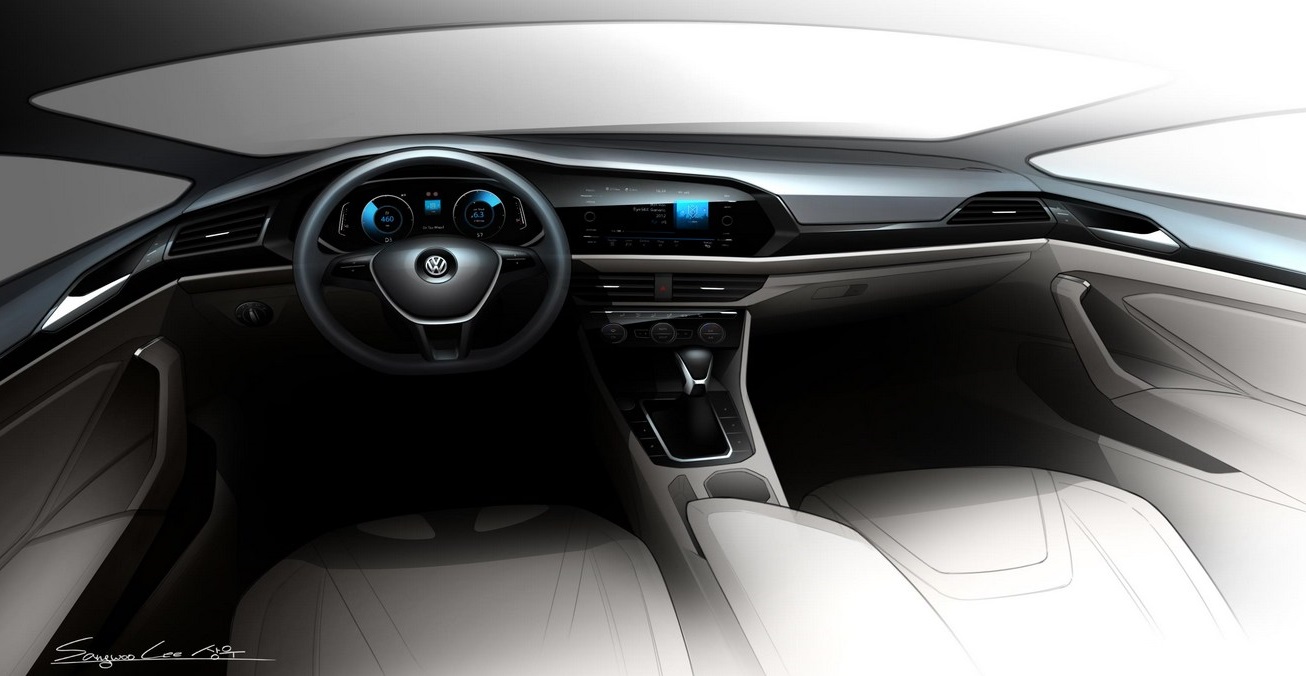 Por dentro, é clara a semelhança com o design horizontal e retilíneo do novo Polo, à exemplo das maçanetas em continuidade com o desenho das saídas de ar laterais, bem como a central multimídia quase unida ao painel de instrumentos, também digital. Certamente, essa será a identidade visual da fabricante para grande parte de seus próximos lançamentos.
