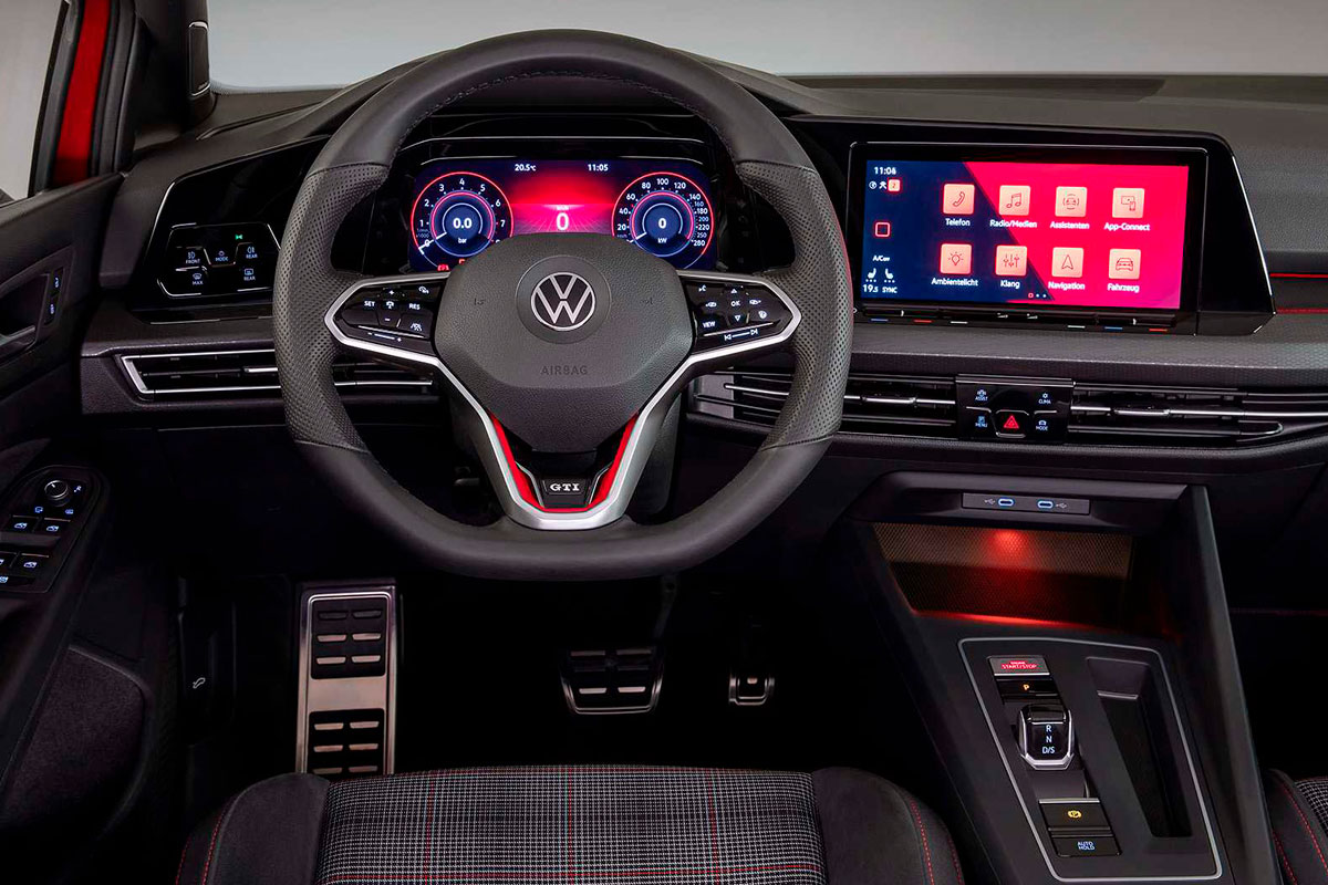 No interior, o GTI traz nada menos do que 2 telas – uma para o quadro de instrumentos de 10,25 polegadas, e uma de 10 polegadas para a central multimídia. Além disso, os clássicos bancos em tecido vêm com uma releitura do clássico desenho xadrez.