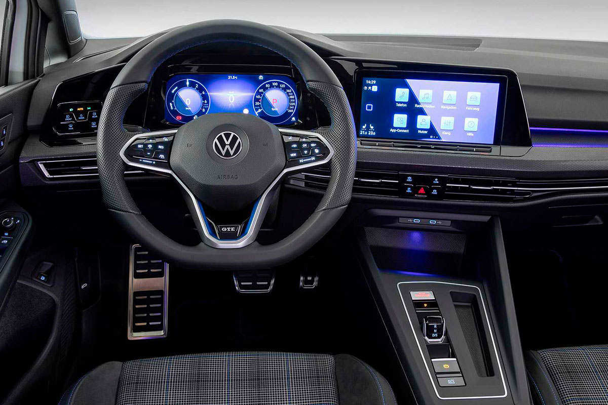 O interior do GTE segue o mesmo layout e pacote de equipamentos da versão topo de linha do Golf tradicional. Preços, e mais detalhes serão revelados na próxima semana, quando o Salão de Genebra abre suas portas.