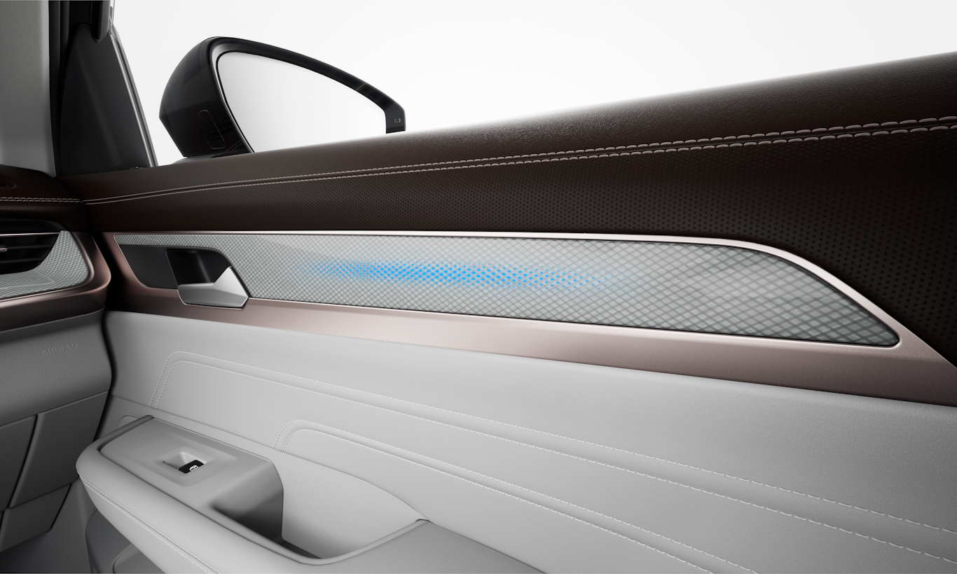 Outro elemento interessante é a faixa de luz camuflada na moldura plástica das portas. Além disso, os bancos tem couro marrom contrastando com acabamento branco. Apesar de o porte sugerir, o Volkswagen Tavendor não leva sete pessoas, mas somente cinco. Esse papel de SUV grande de sete lugares da marca ficou para o Teramont e para o Talagon.