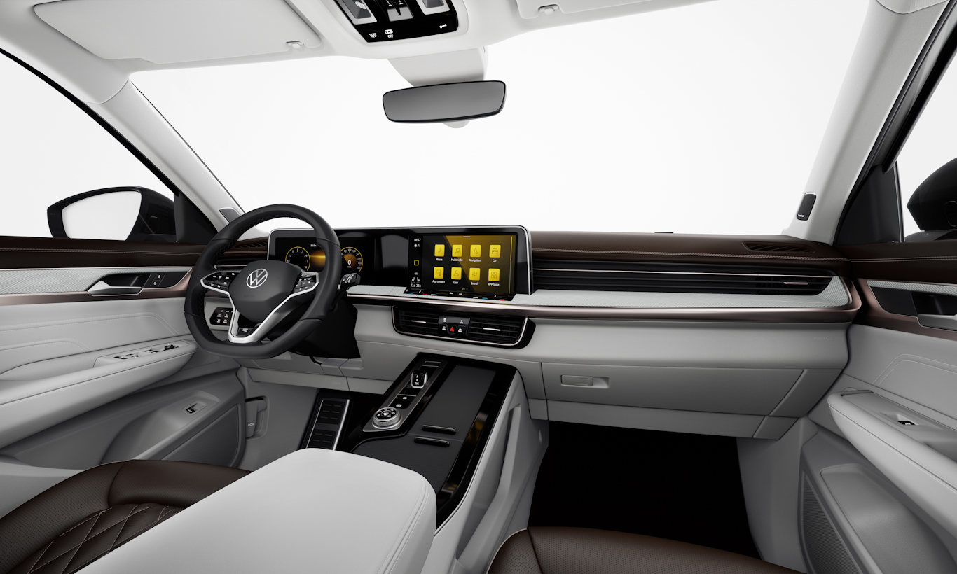 Refinada, a cabine abusa de materiais macios e couro para dar sofisticação. Volante veio do Nivus, assim como o painel de instrumentos totalmente digital. Contudo, ele fica paralelo á central multimídia como nos modelos da Mercedes-Benz. O console central é alto e há um contraste entre a minúscula manopla de câmbio e o grande rotor do seletor de modo de condução.