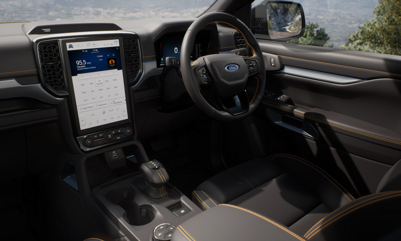 Já a cabine mostra alguns elementos da Ranger e outros próprios. A central multimídia vertical é idêntica entre as picapes, assim como o painel de instrumentos totalmente digital. Mas todos os elementos plásticos são diferentes, incluindo uma nova maçaneta que parece camuflada no descansa-braço. Volante, no entanto, é o mesmo do VW Nivus.