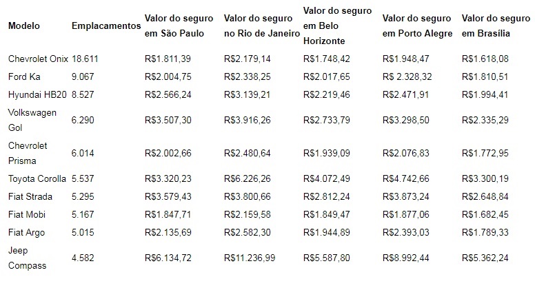 Na tabela, a capital carioca tem o valor de seguro mais caro para quase todos os modelos, com exceção da Fiat Strada, onde a apólice de Porto Alegre (RS) tem o maior valor por R$ 3.873. Já Brasília é o local onde o seguro “pesa” menos no bolso do consumidor.