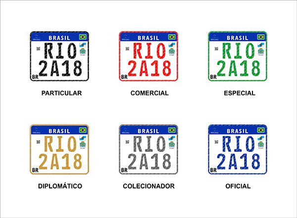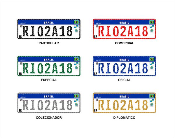 Para identificação das categorias dos veículos, a cor do contorno da placa e da combinação alfanumérica mudará de acordo com o tipo. Será: particular (preta), comercial/aprendizagem (vermelha), oficial (azul), especial (verde), diplomático (amarela) e colecionador (prateada). Apesar de não parecer, o tamanho se mantém o mesmo: 40 cm de largura e 13 cm de altura.