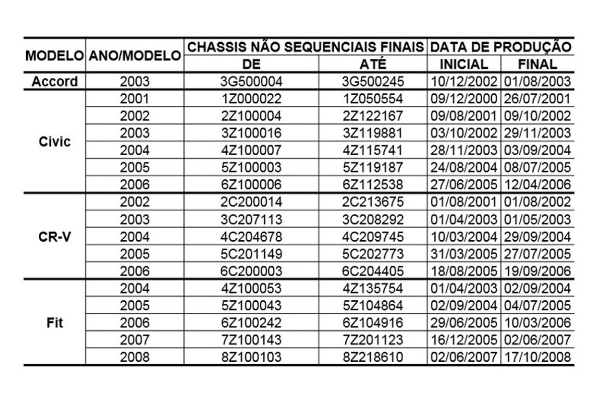 A Honda está chamando os proprietários de quatro modelos por conta de falha no insuflador do airbag dianteiro do passageiro. Os modelos envolvidos são o Civic (2001 a 2006), Honda Fit (2004 a 2008), CR-V (2002 a 2006) e Accord modelo 2003. No total, foram chamados 27.555 veículos para o recall.