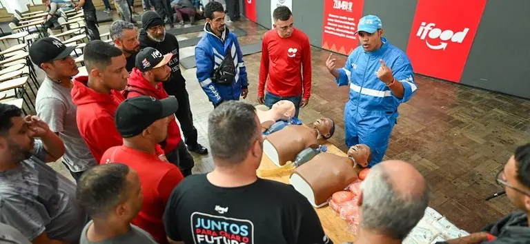O iFood promoveu, com apoio do Ministério da Saúde, a primeira capacitação do Programa Anjos de Capacete, que transforma entregadores em agentes multiplicadores de prevenção e cuidado. A aula-piloto reuniu 100 profissionais no campus da Universidade Zumbi dos Palmares, em São Paulo, com treinamento da Força Nacional do SUS (FN-SUS).