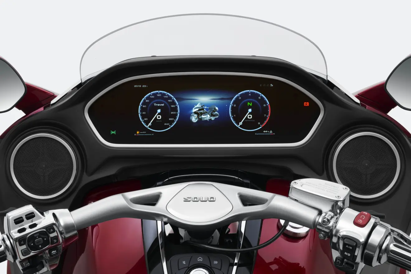 A moto traz um motor boxer de oito cilindros, 2 litros, 154 cv e câmbio DCT de oito marchas, amparados por um chassi de alumínio e uma série de assistências eletrônicas. O painel totalmente digital reforça a aposta da marca em elevar a tecnologia num nicho que costuma ser mais conservador.