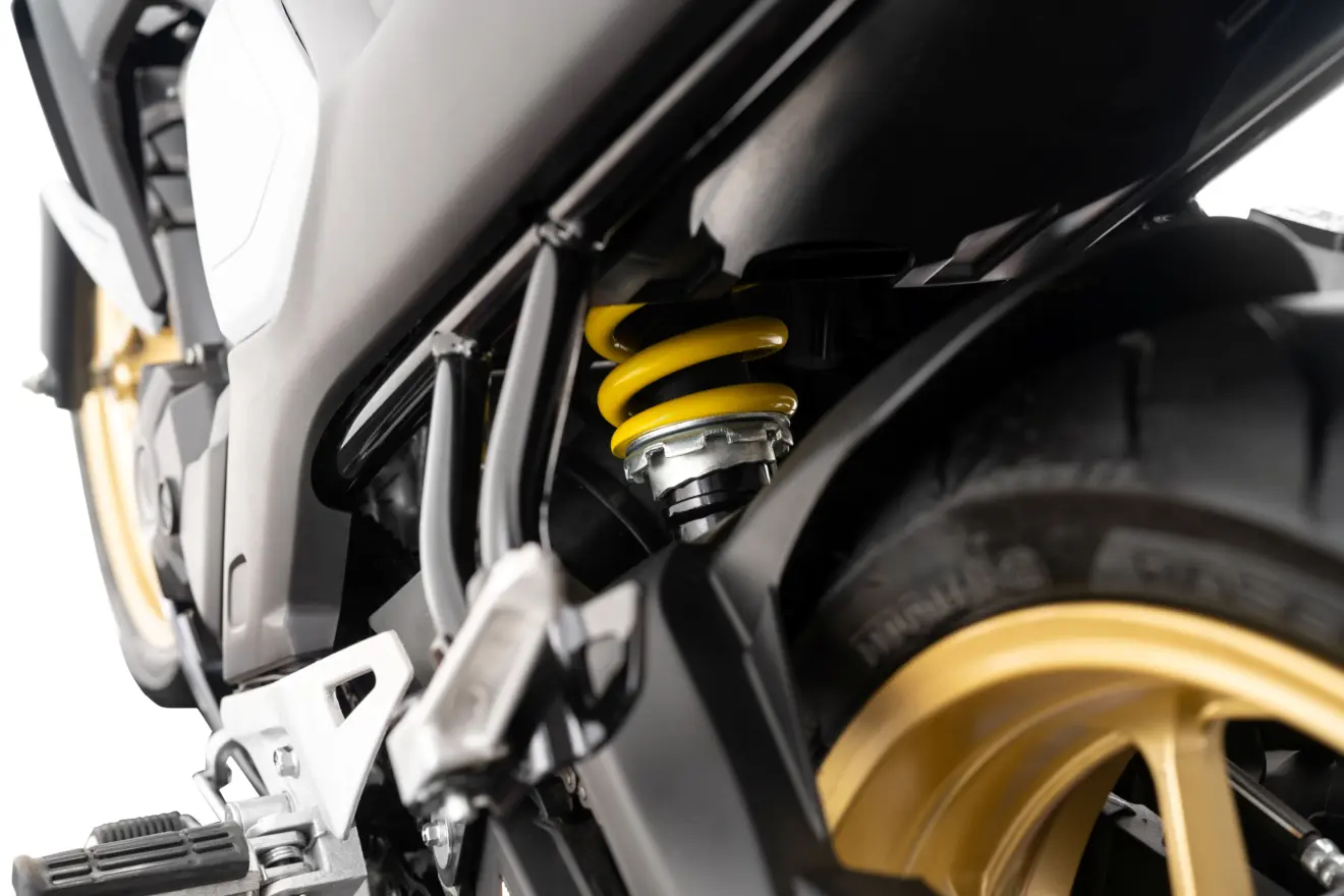 Já o sistema de freios utiliza disco nas duas rodas, com ABS apenas no eixo dianteiro, solução que atende à legislação e oferece segurança adicional em frenagens de emergência. Muito importante para quem circula em pisos irregulares e vias de tráfego intenso.