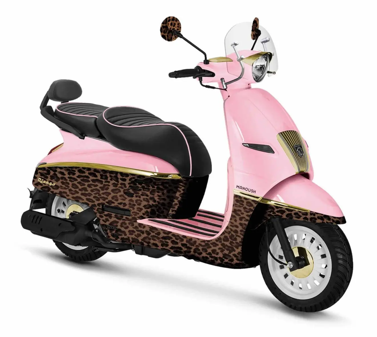 Com pintura rosa pastel e estampas felinas, a Django Manoush exibe detalhes dourados, acabamentos artesanais e um banco feito à mão, inspirado na alta-costura francesa. O pequeno para-brisa retrô e o encosto de passageiro reforçam a vocação da scooter para o conforto e o prazer de pilotar — sempre com elegância.