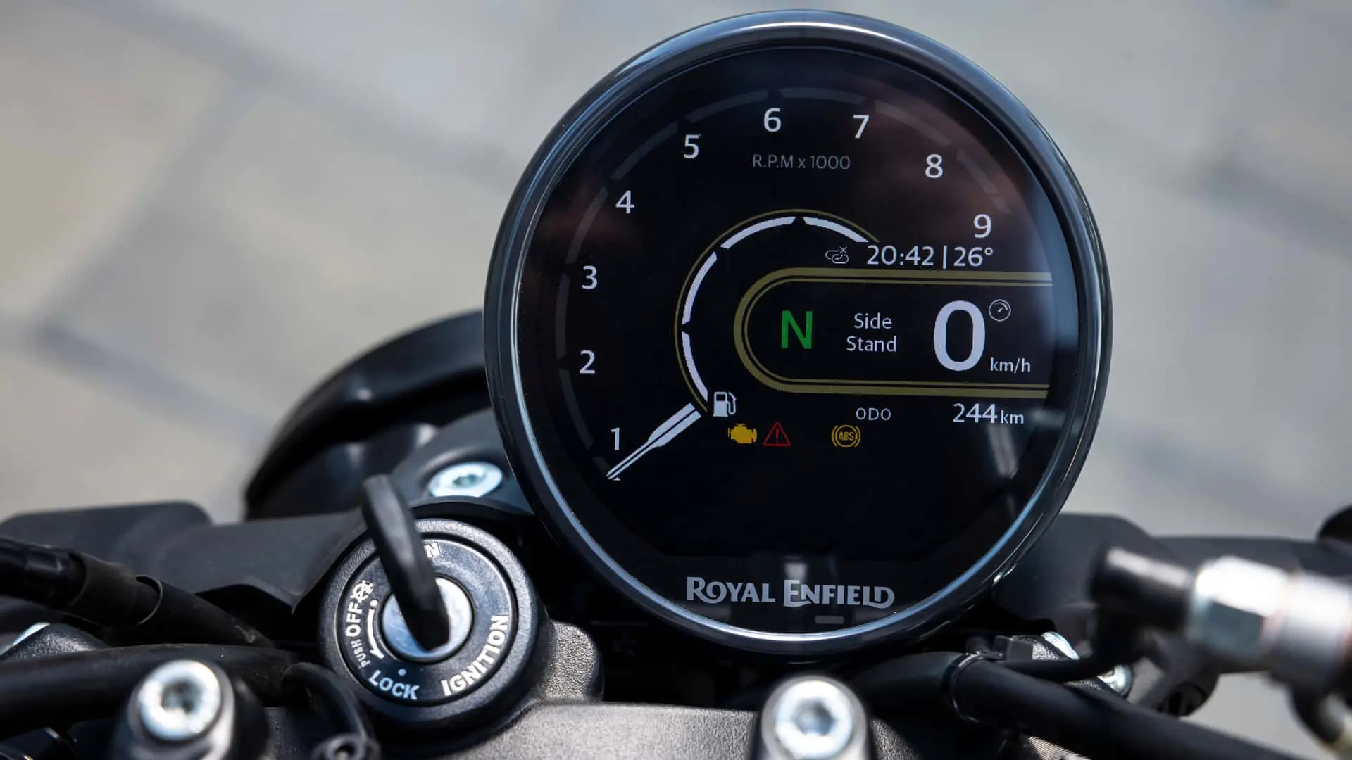 Apesar do espírito “roadster retrô”, a Guerrilla 450 abraça o moderno. Painel 100% digital (TFT), com conectividade para smartphone, Google Maps, controles de mídia e porta USB‑C para carregamento. A resolução (nitidez) do quadro de instrumentos é ótima.