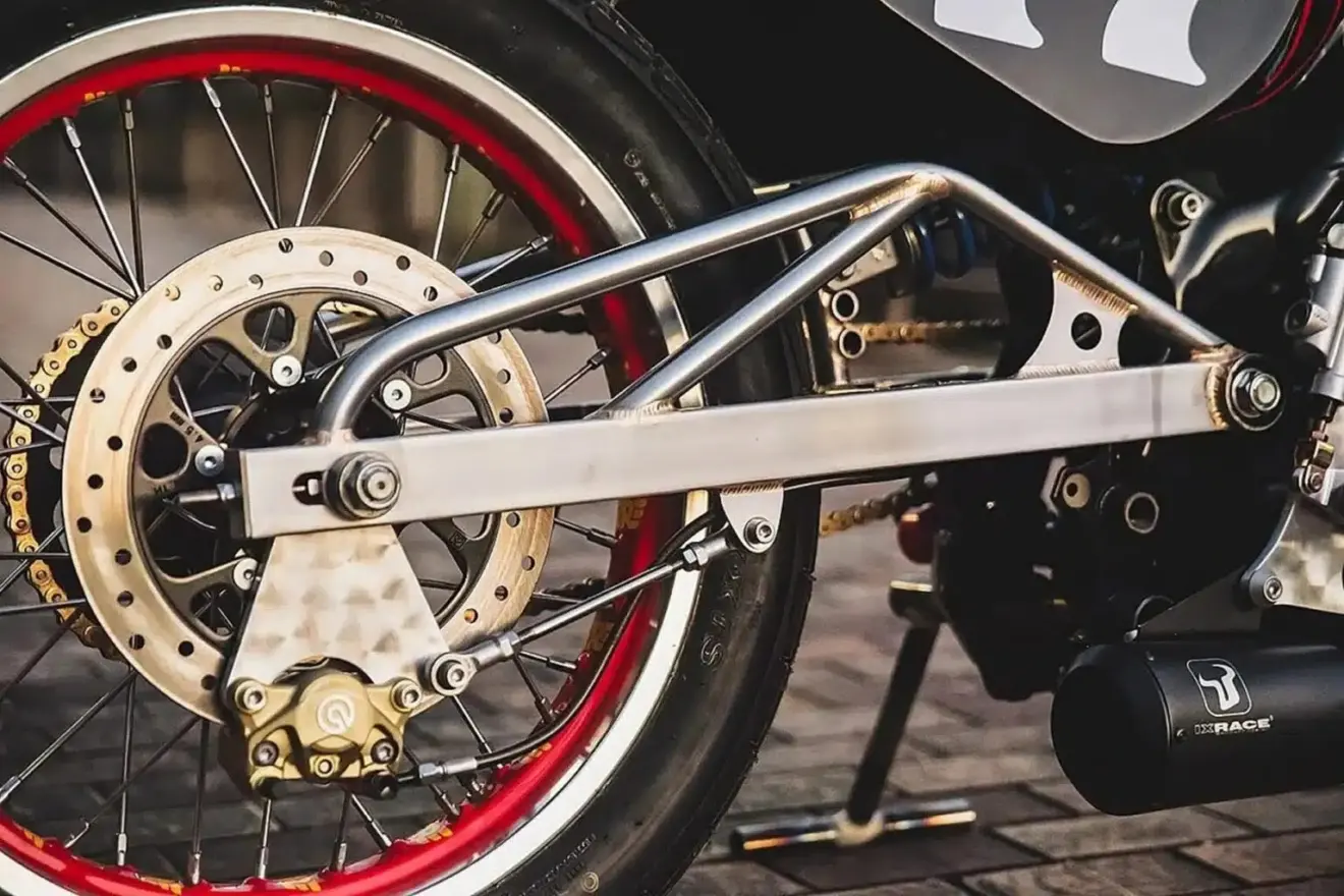 O subchassi traseiro foi completamente reconstruído à mão, enquanto as carenagens em alumínio reforçam o caráter artesanal e funcional do conjunto, eliminando qualquer excesso.