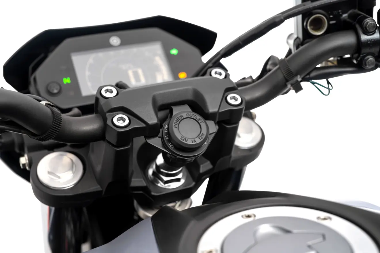 O sistema ainda inclui o ranking ECO, que compara o estilo de pilotagem com o de outros usuários, adicionando um componente lúdico à condução eficiente. A presença da tomada 12V no guidão reforça a vocação prática do modelo, facilitando o uso de smartphones e acessórios no dia a dia.