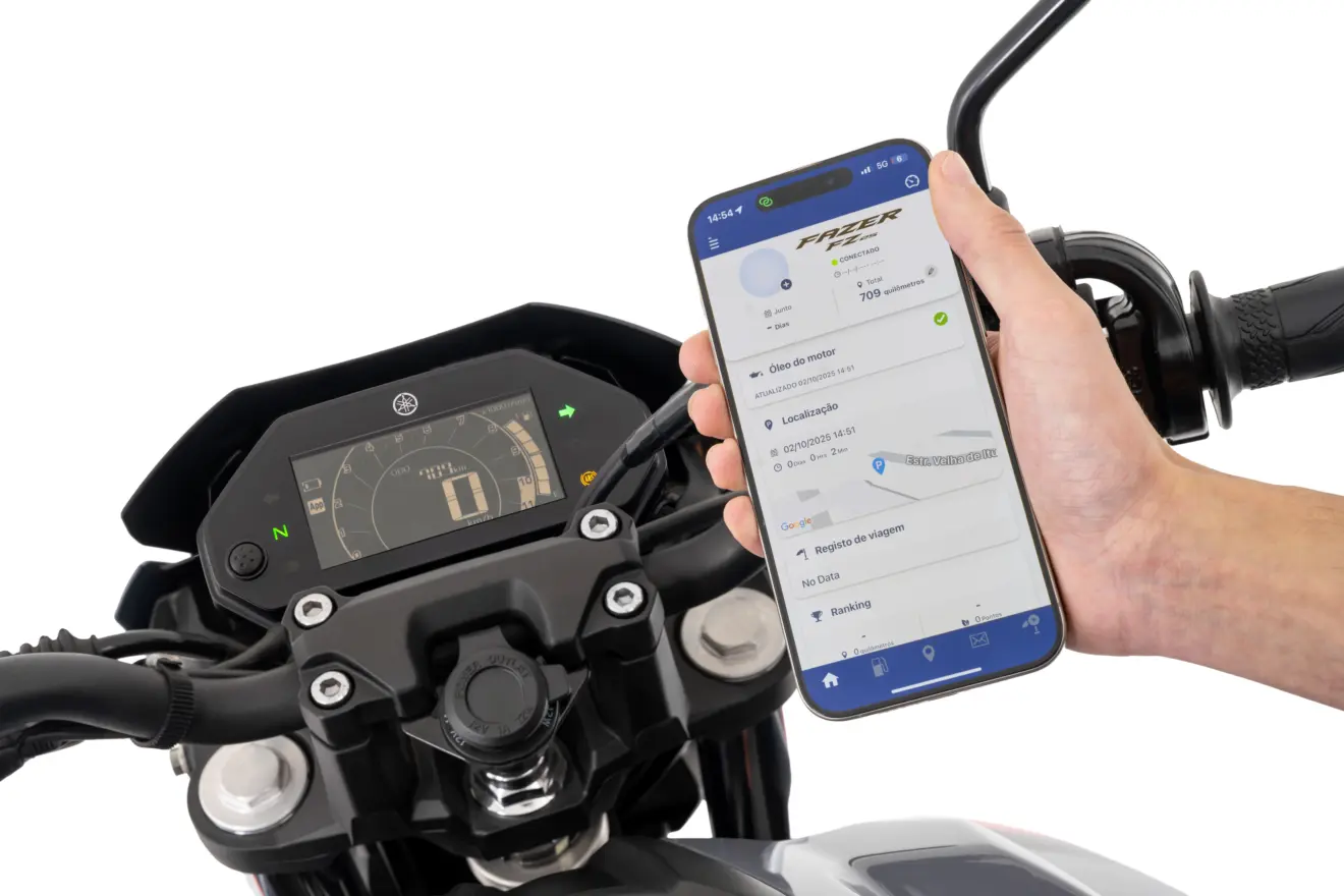 A conectividade continua como um dos grandes trunfos da FZ25 Connected. Por meio do aplicativo Yamaha Motorcycle Connect (Y-Connect), o piloto acessa dados como consumo médio, histórico de viagens, cronograma de manutenção e localização do último pareamento.