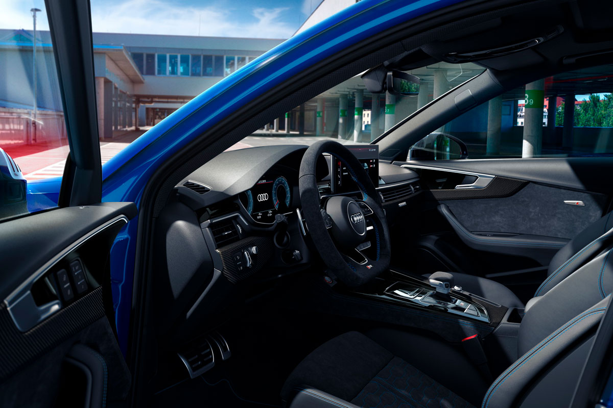 No caso do TT, RS 4 e RS 5 o interior recebe bancos esportivos com couro Nappa e painéis de Alcantara. Já no caso do RS 6 Avant e do RS 7, os bancos são envoltos em couro Valcona perfurado com uma leve sombra azul na perfuração.