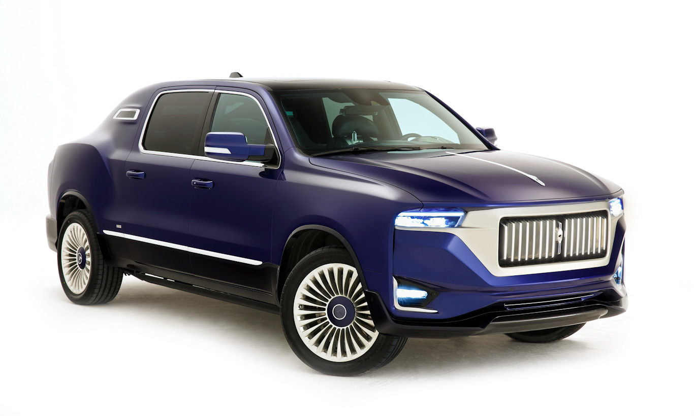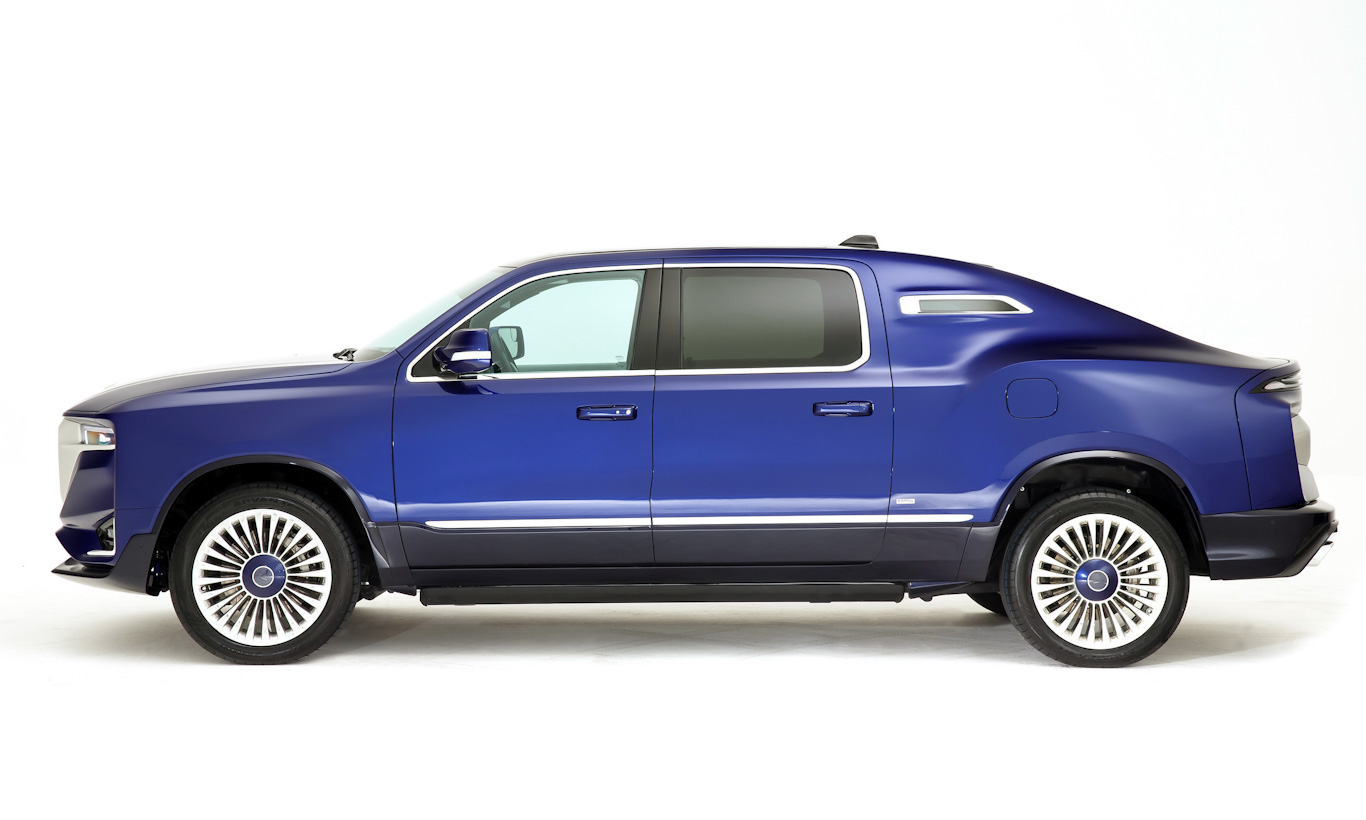 Além de ser mais rápido que a picape, o Aznom Palladium tem visual evidentemente inspirado nos clássicos sedãs britânicos como Bentley e Rolls-Royce. A dianteira cobre parcialmente os faróis originais da RAM, que se integram à enorme grade frontal cromada.