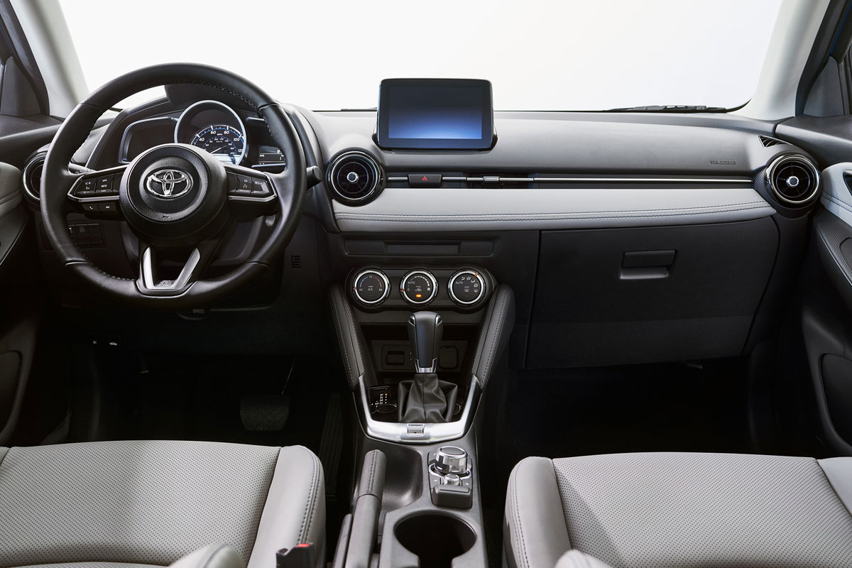 Já no interior, a Toyota decidiu repetir a receita e utilizar o mesmo visual do sedã e do Mazda 2, com linhas simples e elegantes. O painel conta com uma central multimídia de 7 polegadas, que tem conexão com o Android Auto e Apple CarPlay, além de reconhecimento de voz e câmera de ré.