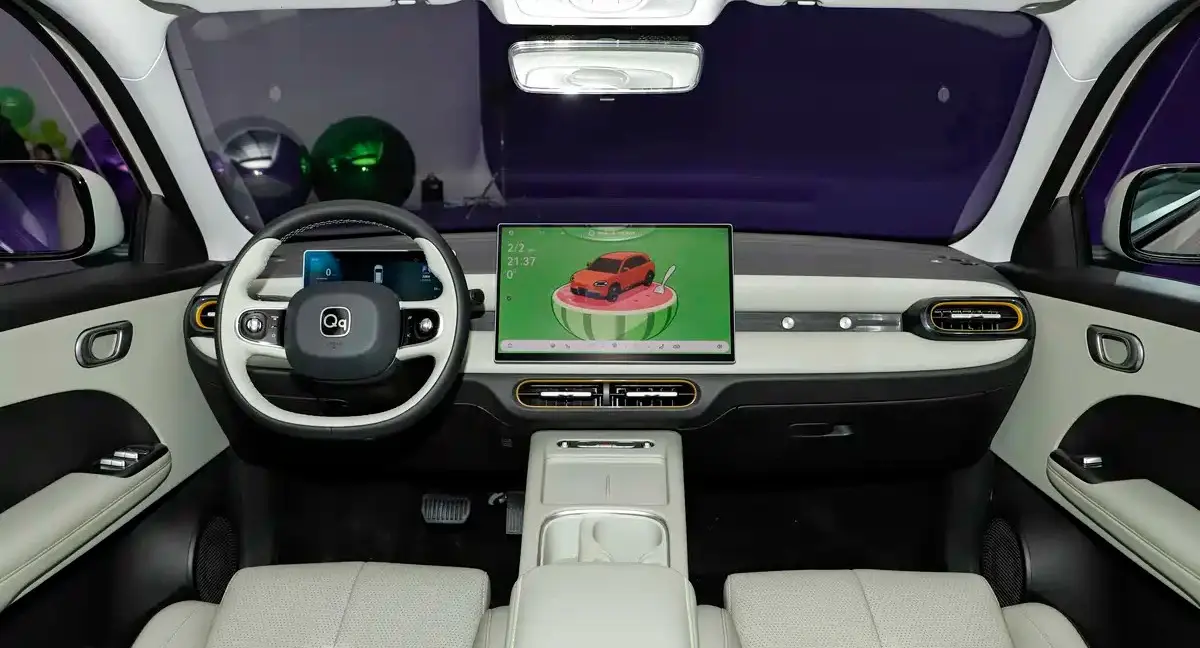 O interior do novo Chery QQ acompanha a tendência atual dos carros chineses: uma ambientação limpa, sem a presença de comandos físicos. O painel é dominado pelo multimídia de 15,6 polegadas e o quadro de instrumentos é totalmente digital. O pacote tecnológico inclui iluminação ambiente com 256 tonalidades, carregador de smartphone por indução e interação por voz via inteligência artificial.