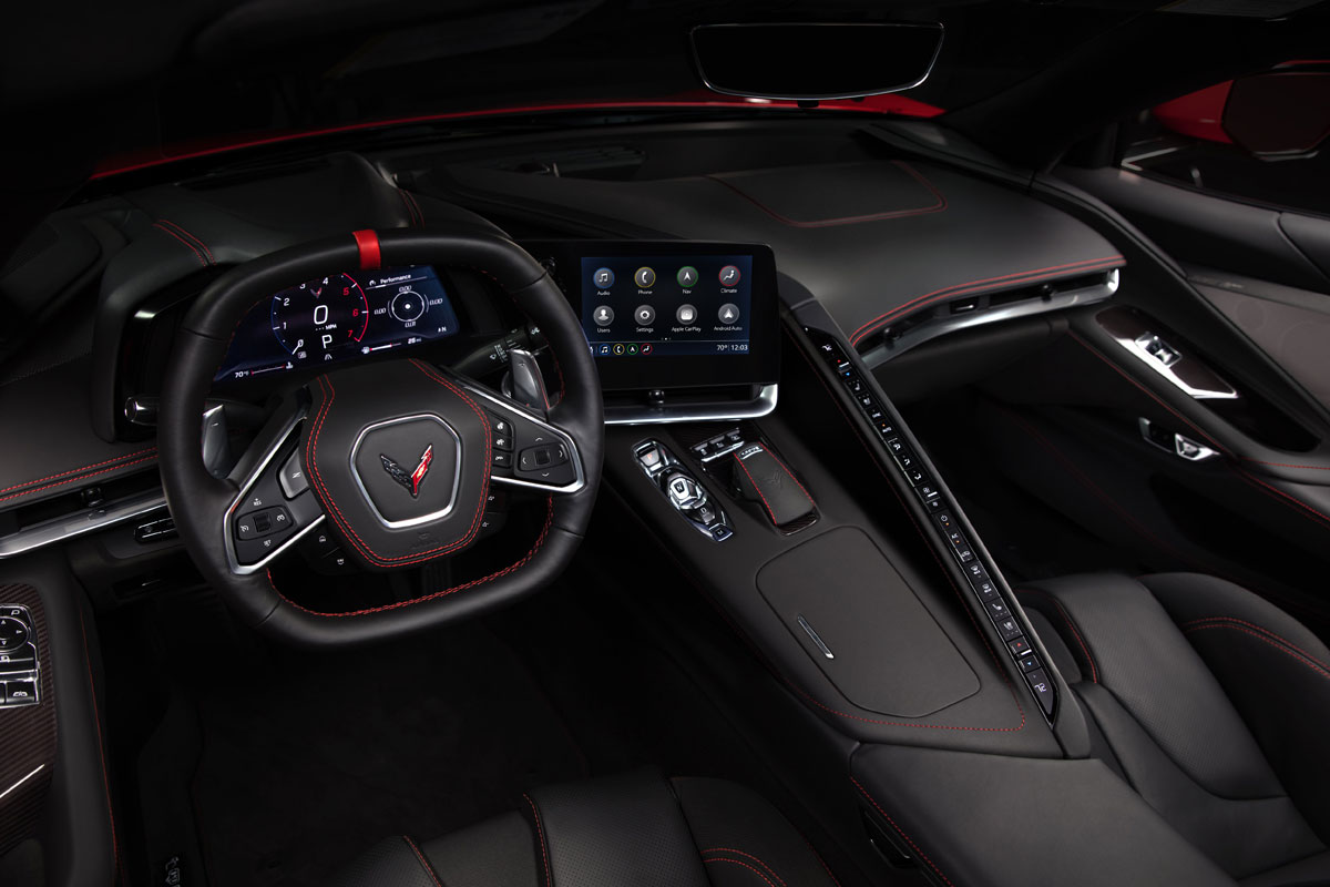 No interior, a Chevrolet apostou em tecnologia e conforto para o motorista e passageiro. Dentre a longa lista de equipamentos, a Chevrolet colocou no Corvette seletor de modos de condução com seis níveis, som premium Bose com até 14 alto-falantes e as três opções de assento, sendo um deles para uso em pista.