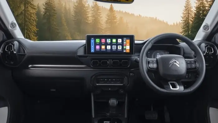 Por dentro, o Citroën C3 2026 indiano traz chave presencial, revestimento de couro no painel, porta-objetos nas laterais de porta com plástico mais claro, painel de instrumentos digital, volante revestido em couro e melhorias gerais de acabamento. Até mesmo a lista de equipamentos foi ampliada.