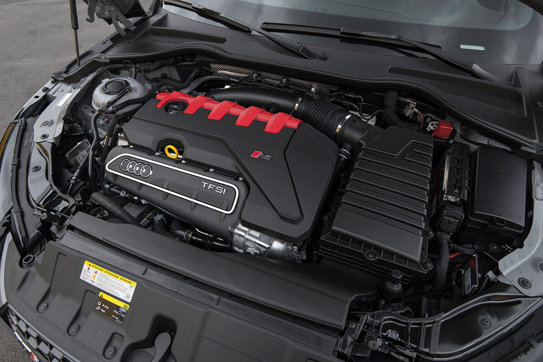 Debaixo do capô, está escondido o motor cinco cilindros turbo 2.5 que entrega 400 cv e 49 kgfm de torque (disponível desde 1.700 rpm), que garante um som próprio nas aceleradas mais fortes. Esse conjunto é combinado a caixa automatizada de dupla embreagem S-Tronic de sete marchas e tração integral quattro.