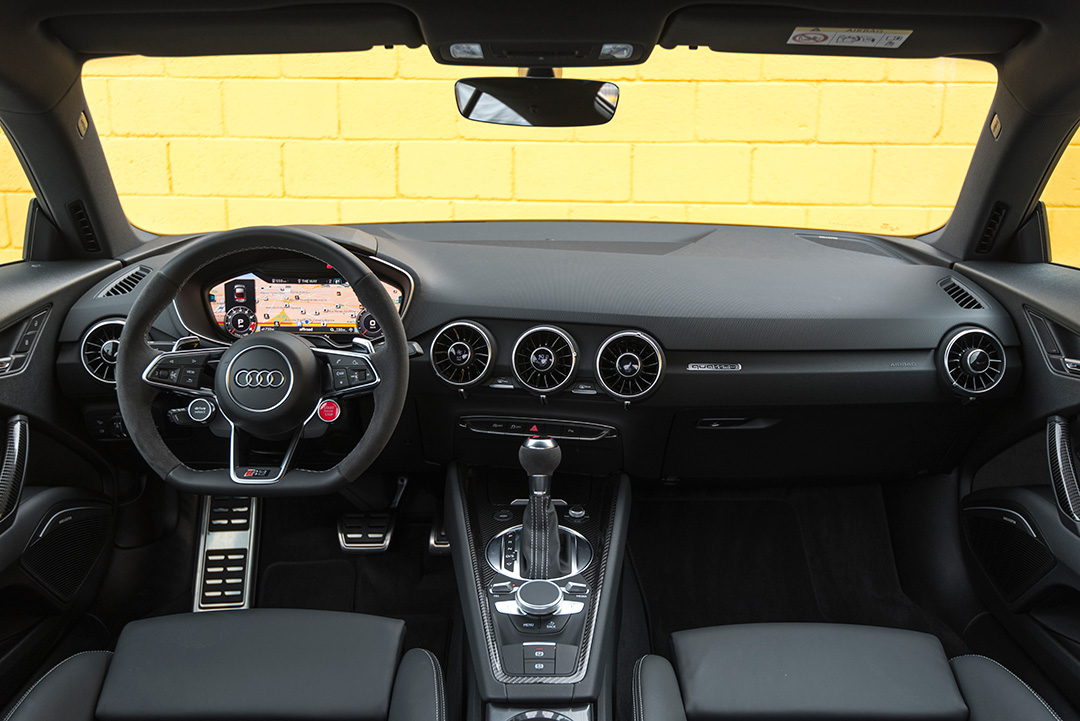Entre os itens de série, o TT RS traz o conhecido painel de instrumentos configurável Audi Virtual Cockpit, bancos esportivos de couro Napa Fina, acabamento interno de fibra de carbono, volante com base achatada e faróis de leds. Há ainda chave presencial, seletor de modos de condução, câmera de ré e sistema de som Bang & Olufsen com navegador GPS e compatibilidade com smartphone.