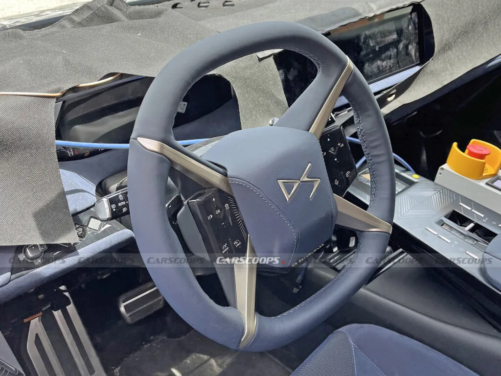 O destaque do interior desse novo crossover elétrico é o novo volante da DS Automobiles com quatro raios em forma de X, além do console central texturizado com botões físicos em posição vertical e um espaço que parece ser destinado a um touchpad.