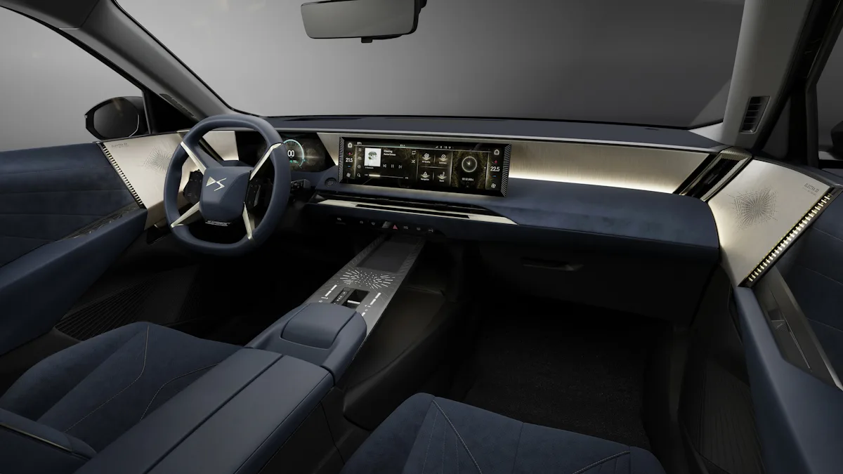 Na tentativa de traduzir o luxo da arquitetura e das grifes francesas para um carro, a DS recheou a cabine do nº8 com muitos mimos. O que mais chama a atenção é o volante em X, que destaca o painel de instrumentos totalmente digital. A central multimídia é uma tela fina e larga, que domina a porção central do painel.