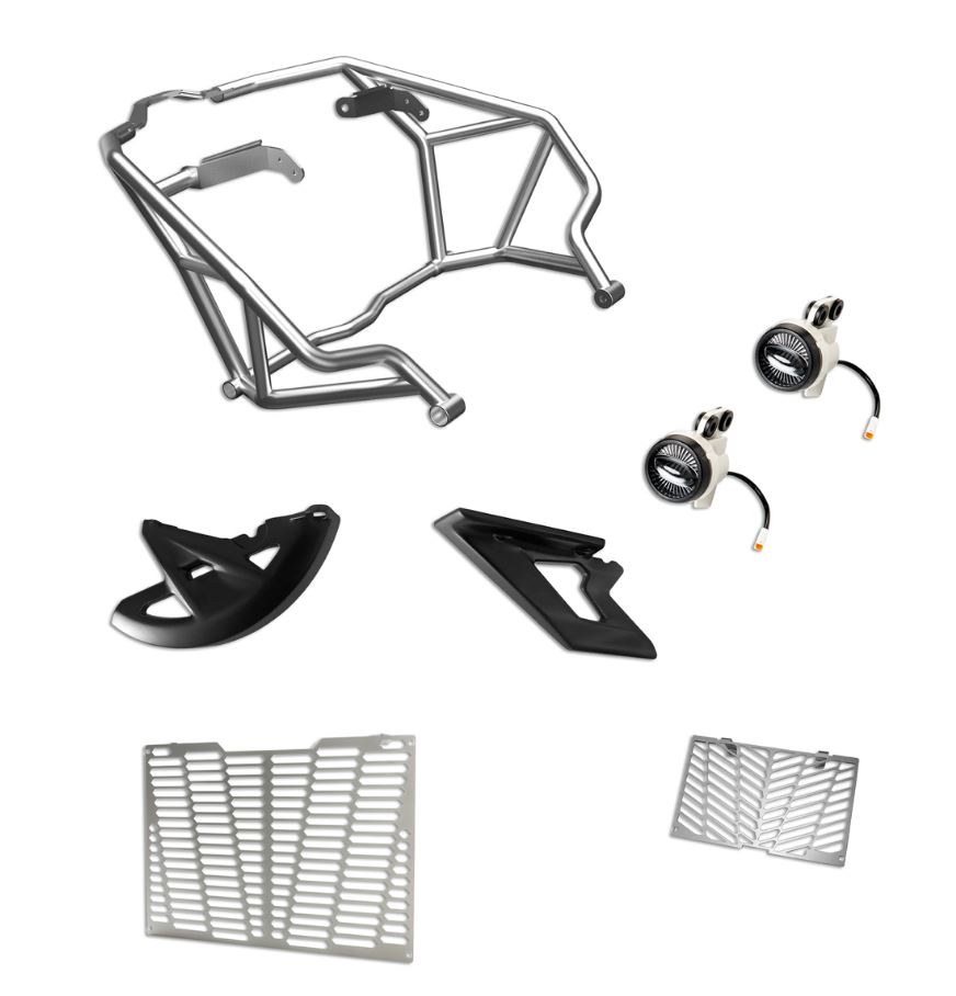 O modelo chega por aqui equipado com dois kits: Touring e Enduro. No primeiro, há malas laterais de alumínio, manoplas aquecidas e bolsa de guidão, enquanto que no segundo estão inclusos faróis auxiliares, protetor de motor, protetor de radiador e protetor de disco e correia.