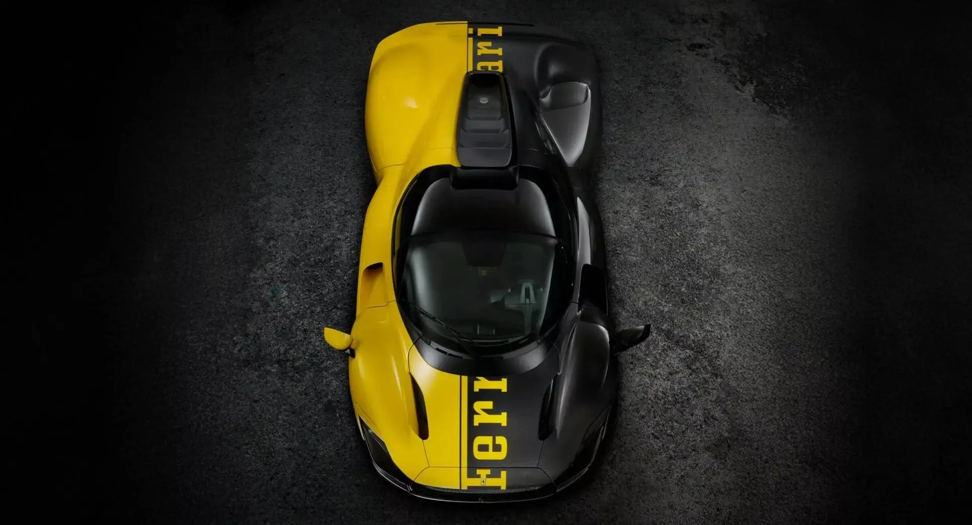Ao levantar as portas estilo tesoura, o interior revela revestimento Q-Cycle feito com pneus reciclados, cintos de segurança em amarelo e o emblema do cavalo rampante nos encostos de cabeça. A fibra de carbono também está presente no painel de instrumentos e na coluna de direção, exibindo um padrão inspirado na bandeira quadriculada.