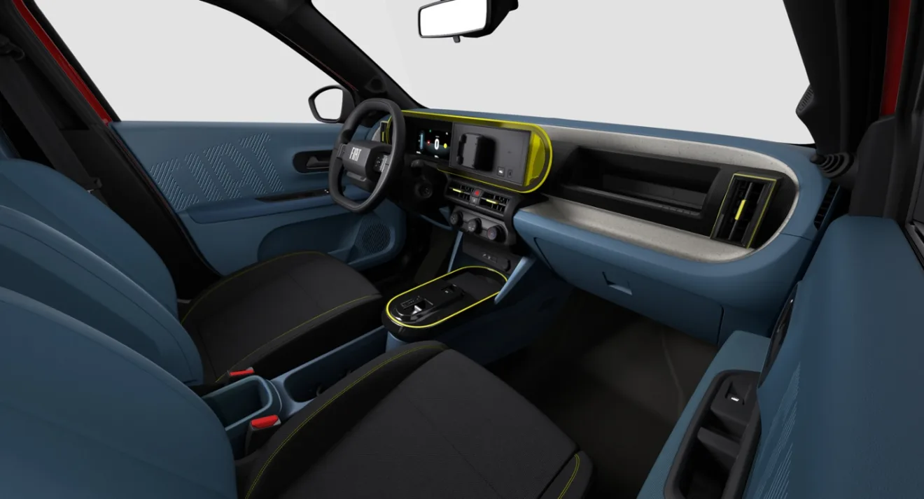 Todas as versões do Fiat Grande Panda contam com cabine em tom azul e detalhes em amarelo. E a configuração Icon (€ 19.400) possui seletor de modos de condução, detector de fadiga, rádio touchscreen de 10,25 polegadas, faróis Pixel LED e lanternas de LED, vidros elétricos traseiros, além de coluna de direção ajustável em altura e profundidade.
