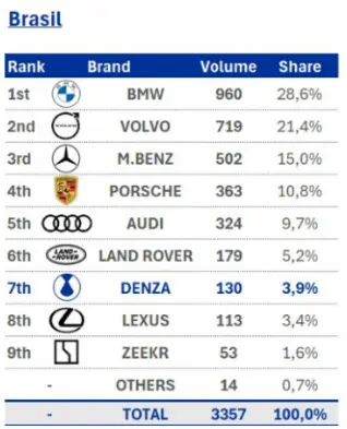O fator novidade, impulsionou a marca com o SUV off-road B5. Com um volume de 130 unidades no Brasil, a Denza superou a veterana Lexus, cujo volume foi de 113 unidades. Um resultado que aponta para uma mudança na mentalidade do consumidor brasileiro de alto padrão.