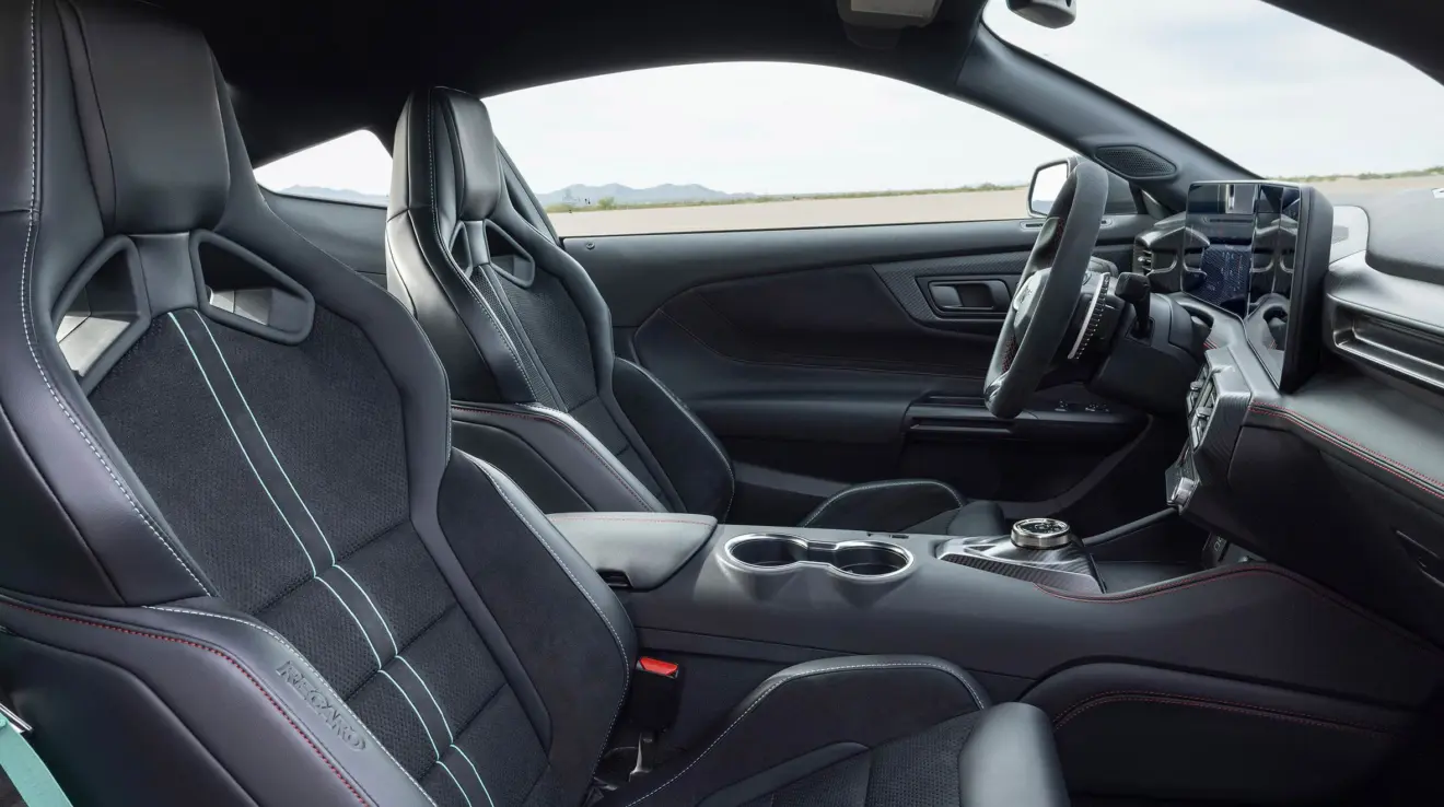 No interior, o Mustang Dark Horse SC traz o volante de base chata revestido em couro do Mustang GTD, com comandos de performance e detalhes em Alcantara e fibra de carbono. Os bancos esportivos opcionais Recaro em couro e Dinamica, material ecológico premium, fazem parte do Track Pack, com opções de acabamento em cinza ou azul-esverdeado (Teal), além de uma tampa no lugar dos bancos traseiros.