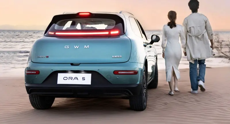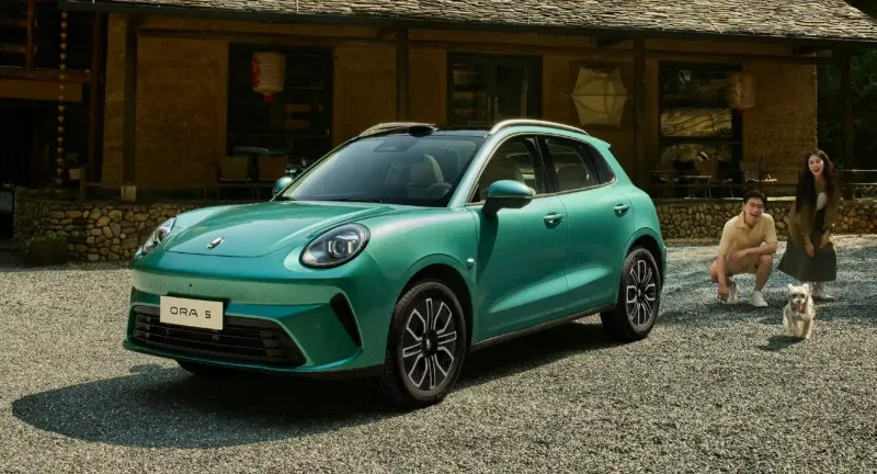 Com autonomia de até 580 km, o SUV elétrico Ora 5 mantém o design de inspiração retrô, exibindo faróis ovais e entradas de ar integradas ao para-choque dianteiro pronunciado. Entre as opções de cores, há branco, cinza, azul, bege e vermelho.
