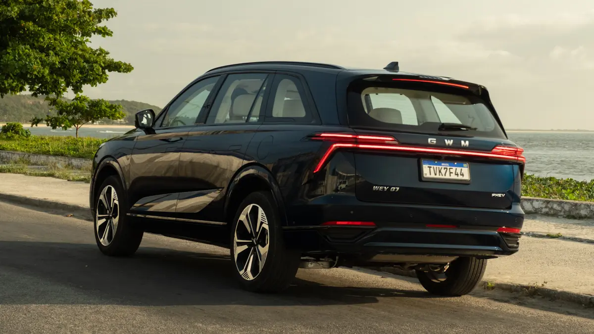 Já a traseira ostenta lanternas interligadas verdadeiramente grandes. Diferentemente da maioria dos SUVs, o Wey 07 não tem plásticos pintados em preto na parte inferior da carroceria para parecer um carro mais alto. Segundo a marca, isso é para dar mais refinamento visual ao carro e juntar o melhor do mundo dos SUVs e das minivans.