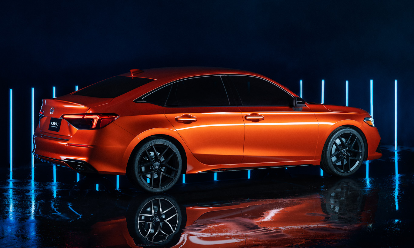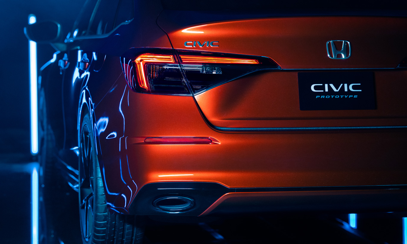 Com toques de Volkswagen Jetta, a traseira tem lanternas invadindo a tampa do porta-malas em um layout que também se assemelha ao Accord. Saídas duplas de escape ajudam a dar um aspecto mais esportivo ao Civic, ainda que bem mais contido que o modelo atual.