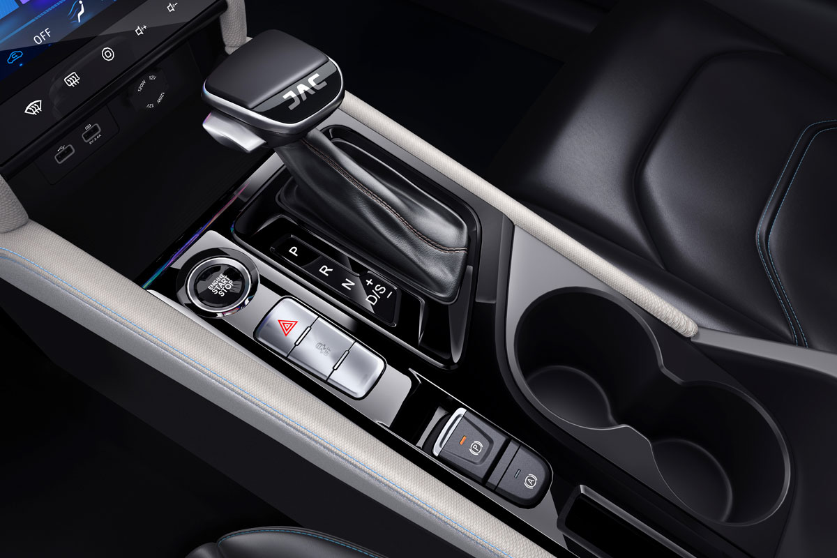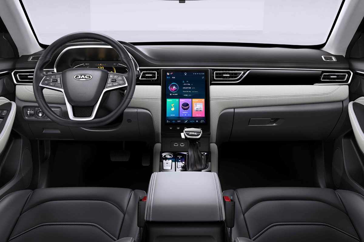 A traseira aposta em lanternas ligadas por um filete de LED com design moderno e de muito bom gosto. Já no interior, a JAC mostra que modernidade e conforto serão as palavras de ordem. O quadro de instrumentos é 100% digital, e a central multimídia fica na vertical e tem 10,4 polegadas e controla o ar-condicionado e outras funções.