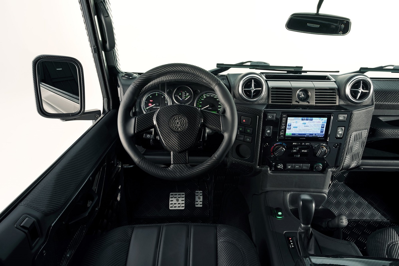 Não pense que a cabine do Land Rover Defender não passou por mudanças, já que recebeu bancos de couro italiano, volante revestido de couro e acabamento em fibra de fibra de carbono no painel, deixando o interior do jipão mais refinado.