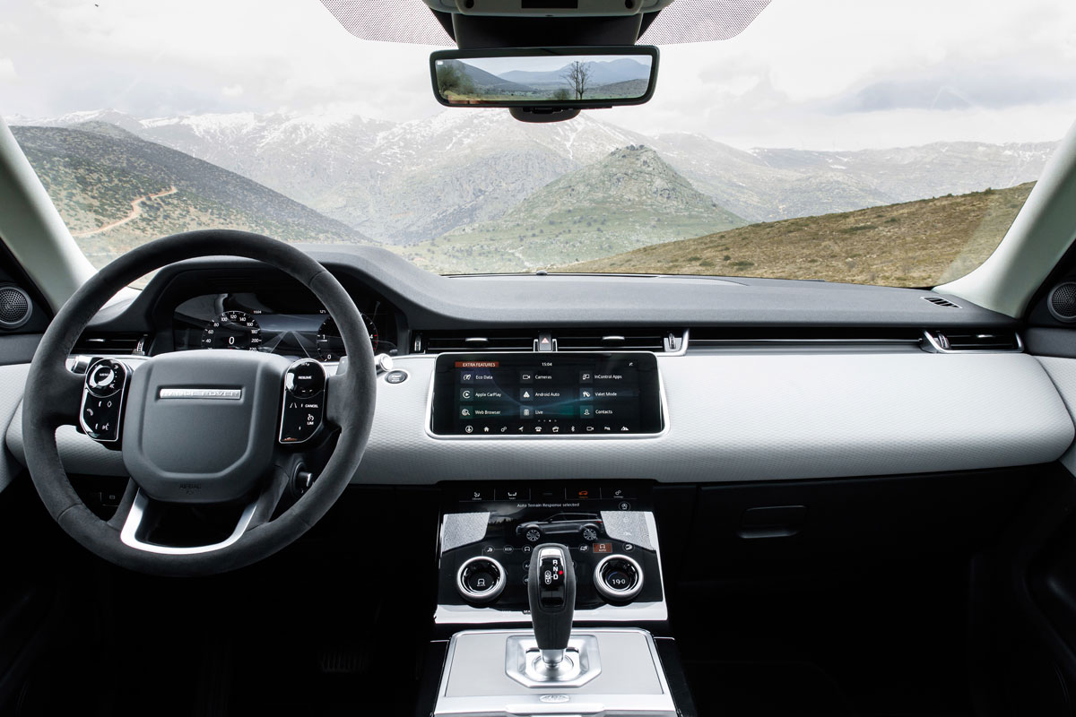 O interior também ganhou mais sofisticação e tecnologia ao adotar alguns recursos tanto estéticos, como de tecnologia do Velar. O quadro de instrumentos ganha uma tela de 12,3 polegadas, enquanto que a central multimídia e os controles do ar condicionado têm uma tela de 10 polegadas sensível ao toque cada.