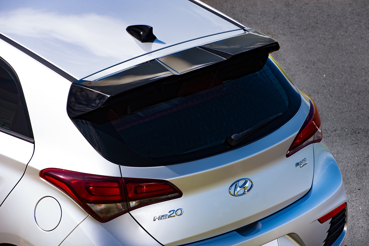 Basta dar uma olhada para ver que o HB20 R spec Limited traz os mesmos itens daquela versão conceito mostrada no Salão, como spoiler traseiro, saias laterais e bancos de couro vermelho — que têm costuras pretas e logo da versão bordado nos apoios de cabeça.