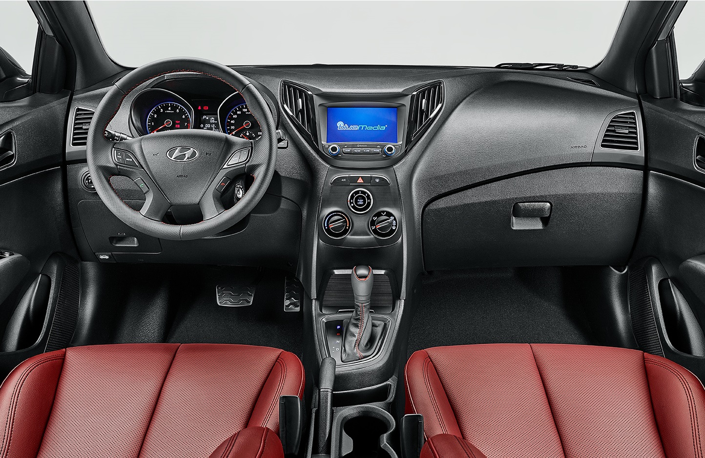 Basta dar uma olhada para ver que o HB20 R spec Limited traz os mesmos itens daquela versão conceito mostrada no Salão, como spoiler traseiro, saias laterais e bancos de couro vermelho — que têm costuras pretas e logo da versão bordado nos apoios de cabeça.