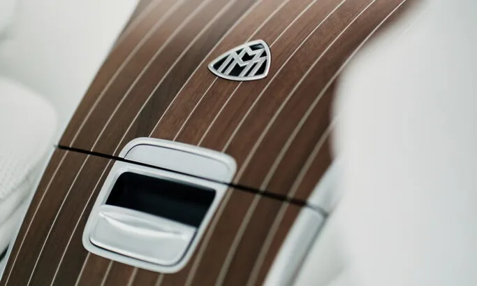 O habitáculo do Mercedes-Maybach também exibe uma generosa dose de painéis de madeira de nogueira, os quais foram cuidadosamente trabalhados para se assemelharem a um convés de navio ou de um iate, que se complementam aos acabamentos de alumínio.