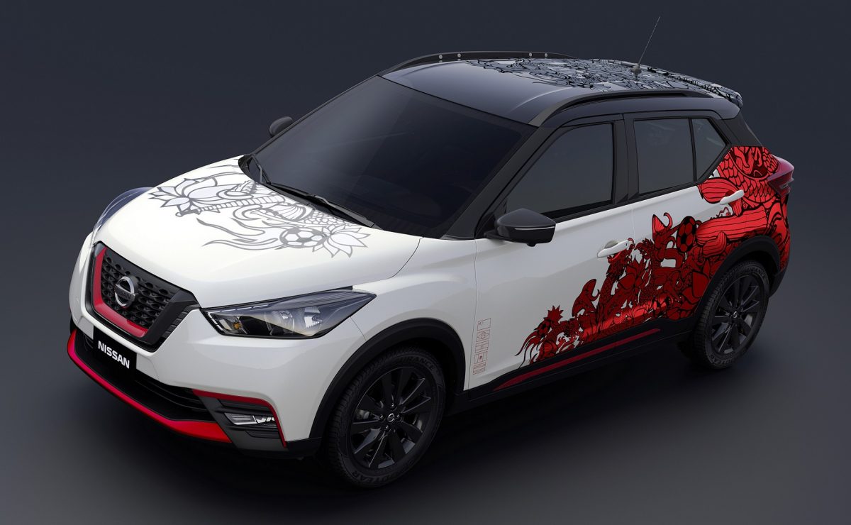 Além disso, o SUV ainda conta com diversos grafites espalhados pela carroceria que trazem uma homenagem. Para homenagear o Brasil, primeiro país a vender o SUV, a marca pintou uma bola de futebol, enquanto que para fazer uma homenagem ao México (primeiro país a produzir o Kicks) foi pintado um cacto. A China é representada por um dragão vermelho, enquanto que a Flor de Lótus representa o Budismo e a Tailândia. Por fim, a Índia é representada por um simpático elefante.
