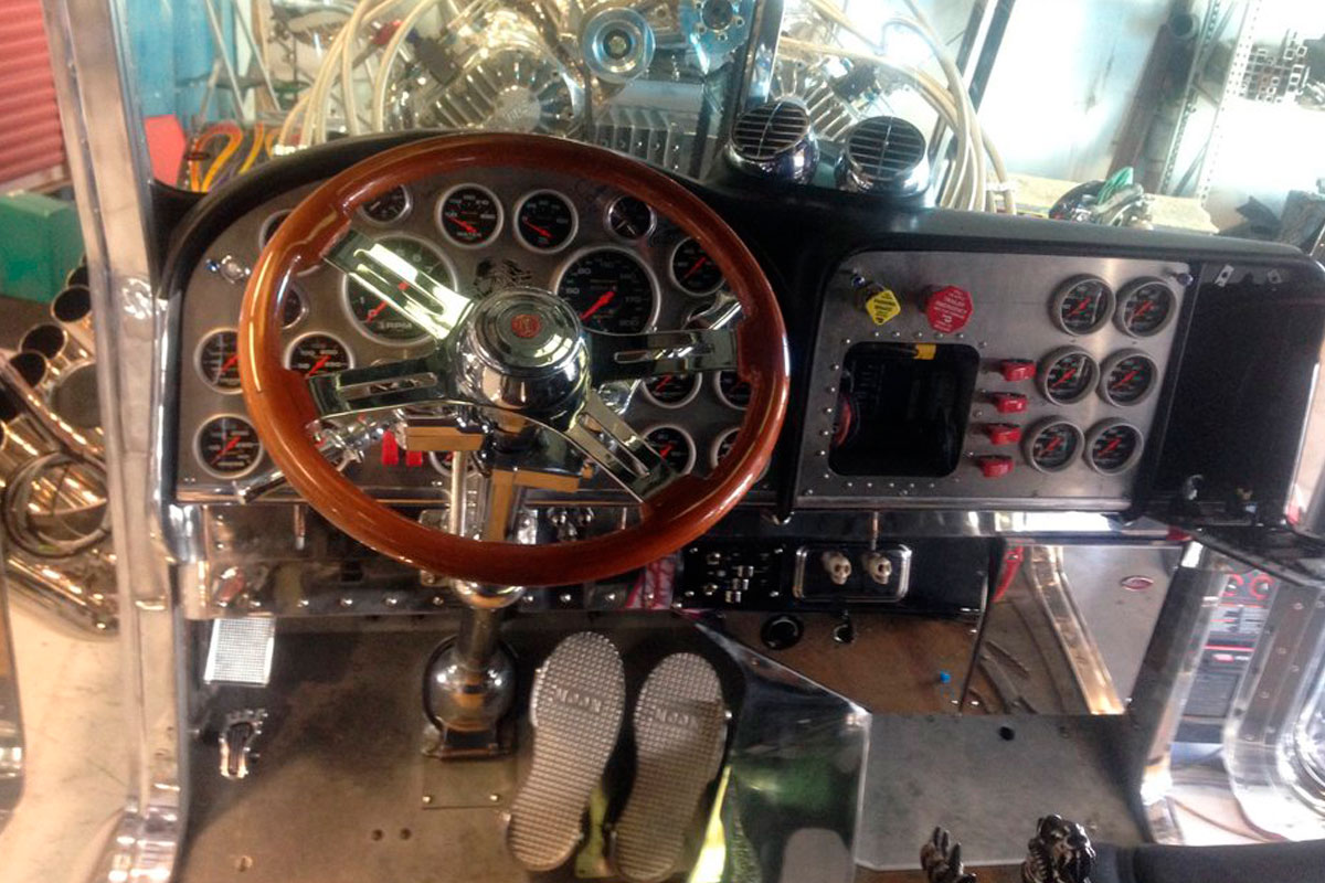 O interior também foi bastante alterado e conta com nada menos do que 24 mostradores para controlar cada passo desse enorme caminhão. Por conta dos enormes motores expostos, Mike precisou instalar câmeras na parte frontal para que enviassem imagens em tempo real para as 4 telas coloridas que funcionam como retrovisores modernos.