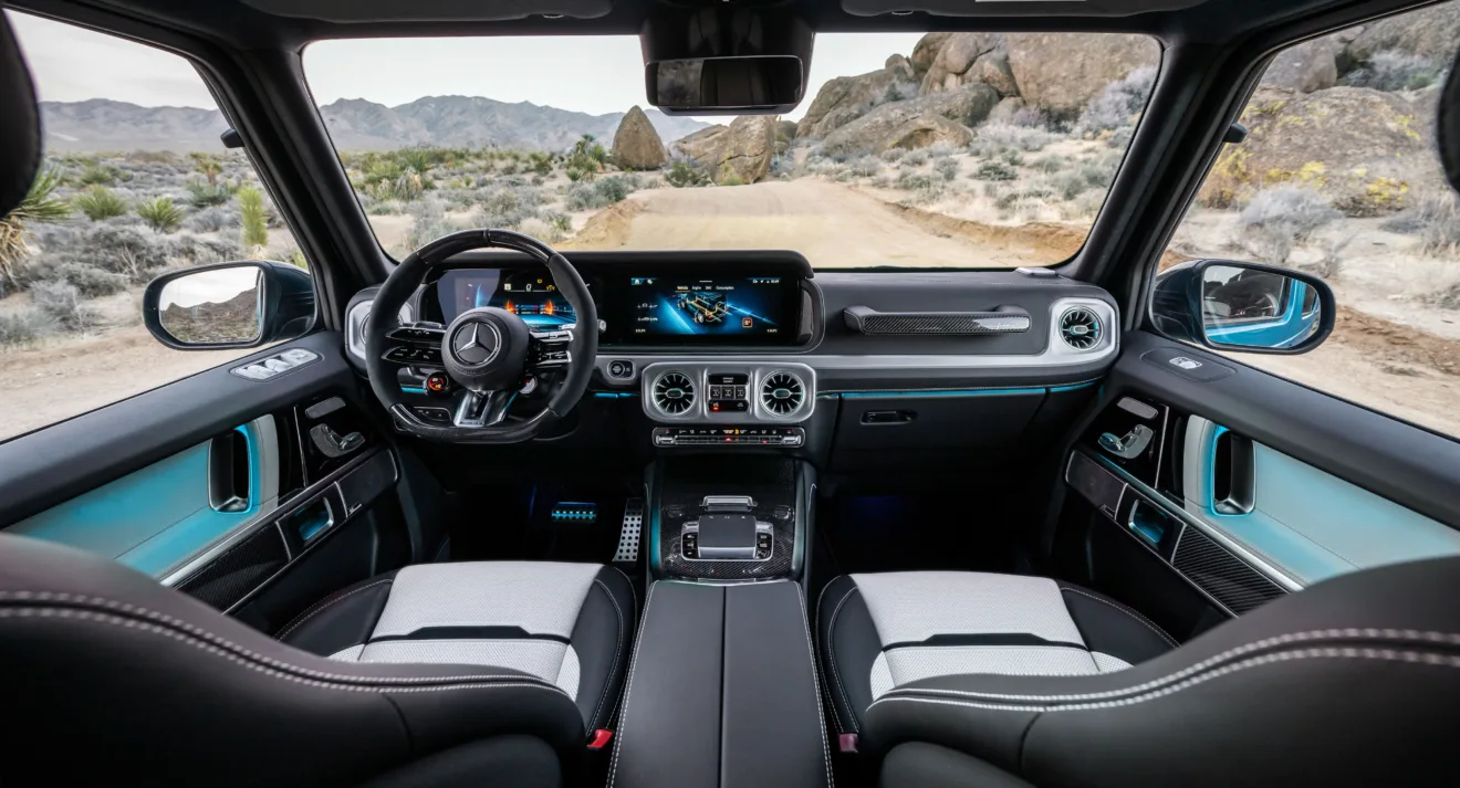 Ao abrir a porta, o interior do Mercedes-AMG G 63 mostra o volante AMG Performance em couro napa, inspirado no automobilismo. O cockpit ainda exibe displays interativos, incluindo o modo “Supersport”, que traz dados de telemetria e informações dinâmicas.