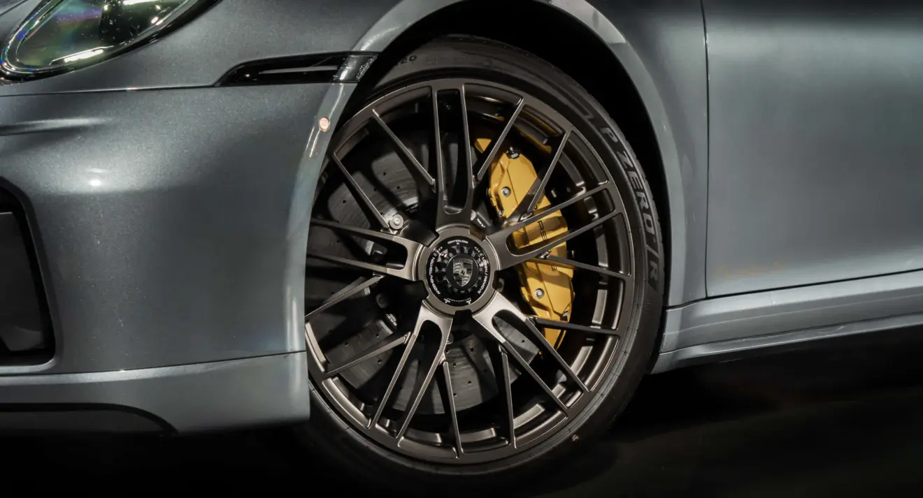 O Porsche 911 Turbo S recebeu o maior sistema de freios de cerâmica (PCCB) já visto em um modelo de duas portas da marca, com discos dianteiros de 420 mm e pinças de 10 pistões. A aerodinâmica inclui flaps verticais ativos na dianteira que se fecham no modo de condução Wet para evitar que o spray de água prejudique a frenagem.