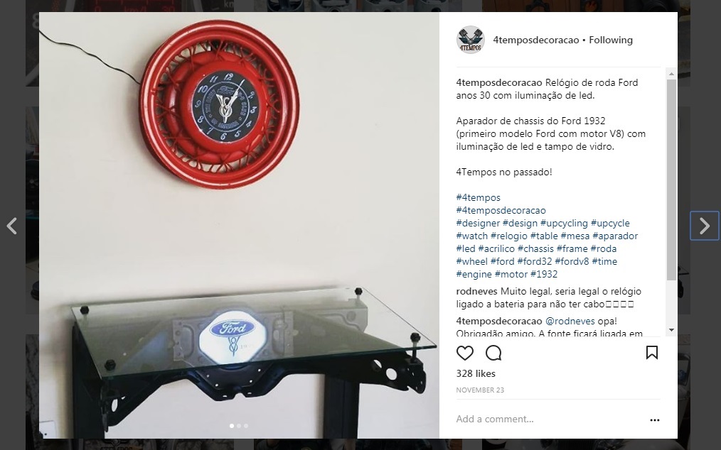 No perfil do Instagram da empresa também estão disponíveis outras peças muito criativas, como um relógio feito a partir de um turbocompresssor, um abajur trabalhado em engrenagens de caminhão Scania, luminária feita com tambor de freio, comando, biela, entre outros componentes aproveitados de motores. Destaque também para um aparador baseado em um chassi do Ford 1932, além de um relógio de parede feito numa roda da década de 1930.