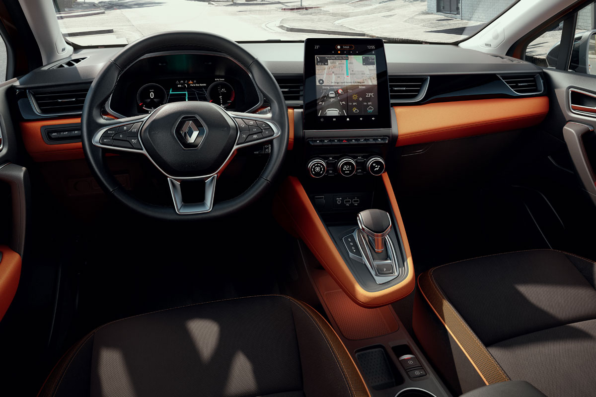 O interior segue a mesma receita do Clio, com direito a nova tela da central multimídia de 10 polegadas, além de oferecer também – dependendo da versão – carregamento sem fio para smartphones.